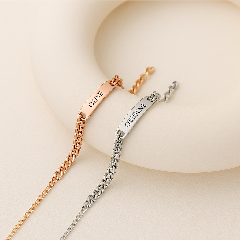 Descubra nuestra pulsera personalizada™, una pieza atemporal diseñada para simbolizar sus momentos más preciados. Fabricada en acero inoxidable de alta calidad, resiste el agua, el paso del tiempo y los imprevistos del día a día sin perder su brillo.